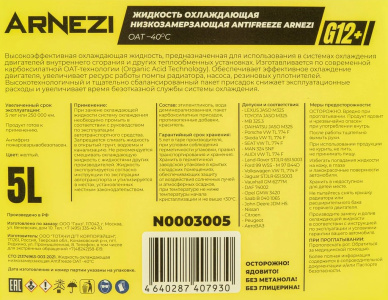 N0003001 — артикул антифриза ARNEZI Yellow G12+ объёмом 1 л. Характеристики: цвет: жёлтый; температура замерзания: −40 °C; температура кипения: 109 °C; допуск производителя: G12+; спецификация OEM: Renault-Nissan 41-01-001/- -S Type D