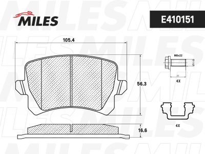 Характеристики тормозных колодок MILES E410151: Длина: 105,4 мм. Ширина: 56,3 мм. Толщина: 16,6 мм. Материал фрикционной накладки: Low-Metallic