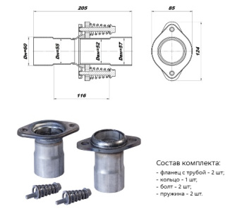 Комплектация: фланец с трубой 2 шт, кольцо, болт 2 шт, пружины 2 шт