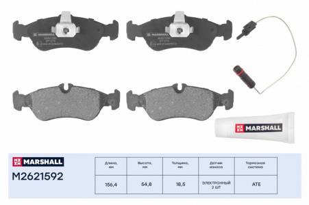 Характеристики дисковых тормозных колодок MARSHALL M2621592: Длина: 156,4 мм. Высота: 54,8 мм. Толщина: 18,5 мм. Вес: 1,59 кг. Ось установки: задняя. Датчик износа: электронный, 2 шт.. Тормозная система: ATE.