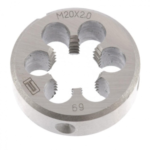 Плашка изготовлена из инструментальной стали. Твердость режущих кромок 60 HRc, что соответствует требованиям ГОСТа (ГОСТ 60–62 HRc). Используется для нарезания внешней резьбы.