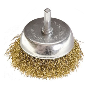 щетка для дрели чашка d75 мм со шпилькой, мягая, латунированная витая проволока MATRIX 74478