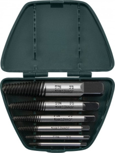 Набор конических многозаходных резьбовых экстракторов для шпилек средних диаметров. Инструменты изготовлены из легированной хромомолибденовой стали, хранятся в пластиковом пенале. Экстракторы имеют присоединительные квадраты разных размеров для передачи крутящего момента. При использовании, в качестве воротка, рекомендуется применение разводного метчикодержателя. В качестве альтернативы можно использовать разводной гаечный ключ или 12-гранную торцевую головку подходящего размера с приводом.