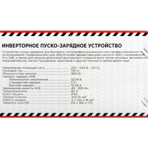Технические характеристики зарядно-пускового устройства Arnezi ПЗУ-100А: